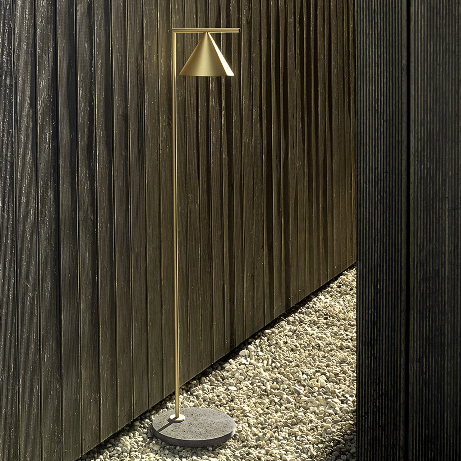 Ihr graziles Gestell aus Messing wird von einem soliden und stabilen Fuß aus Marmor getragen, der in einem natürlichen Grauton den Charakter des Marmorsteins widerspiegelt. Dank der langen Zuleitung lässt sich die Leuchte flexibel platzieren und macht auf der Terrasse eine ebenso gute Figur wie im Eingangsbereich oder an einem Weg im Garten. Der kegelförmige Schirm ist rundherum lichtundurchlässig gearbeitet und strahlt das Licht direkt nach unten ab. Er ist an einer horizontalen Stange montiert und lässt sich bis zu 315° bewegen, wodurch der Lichtstrahl beliebig gelenkt werden kann. Um ein stimmungsvolles Ambiente zu erschaffen, kann die Stehlampe über den integrierten Schalter nicht nur an- und ausgeschaltet, sondern auch gedimmt werden.