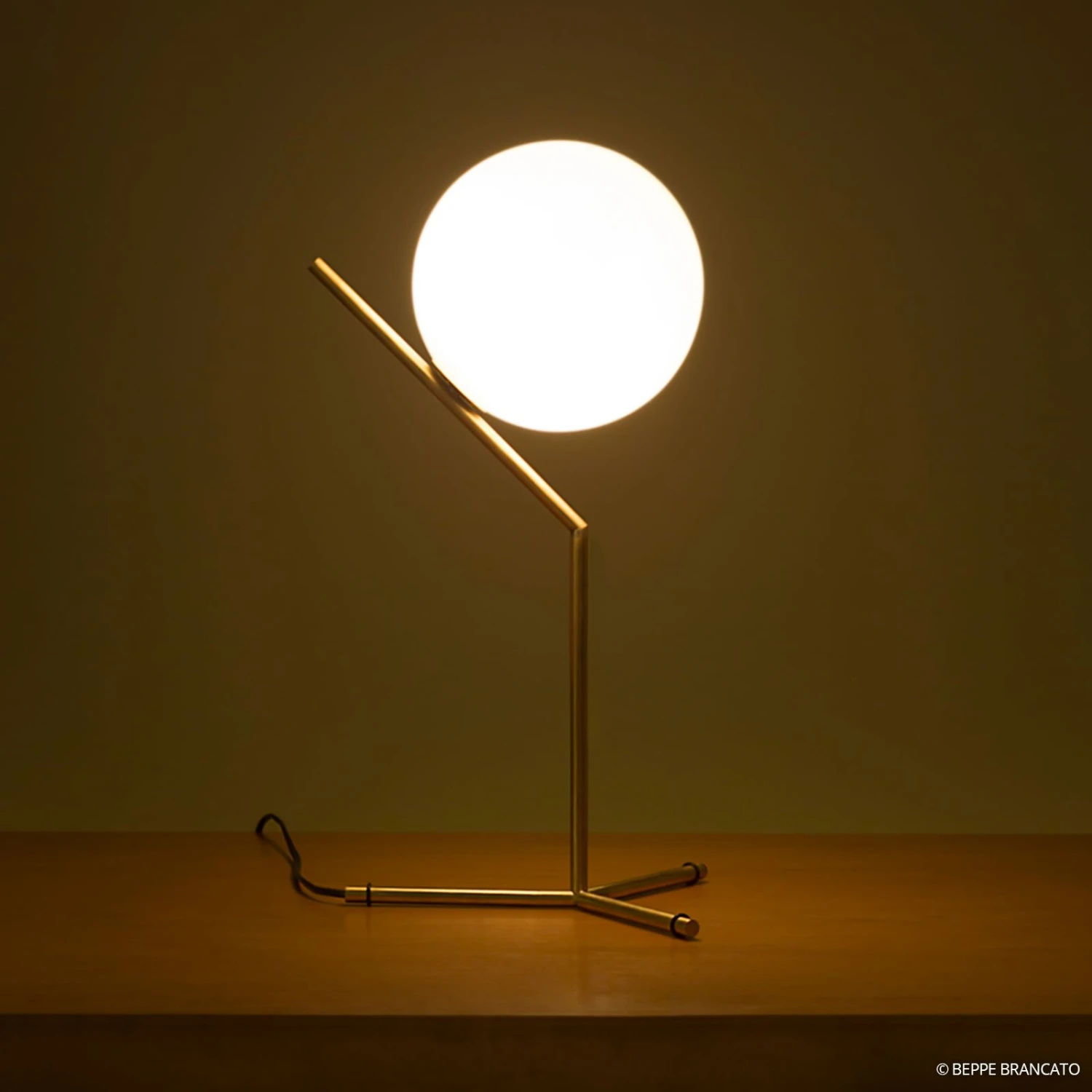 Die Tischleuchte IC – eine Glaskugel balanciert auf einem Messingstab
