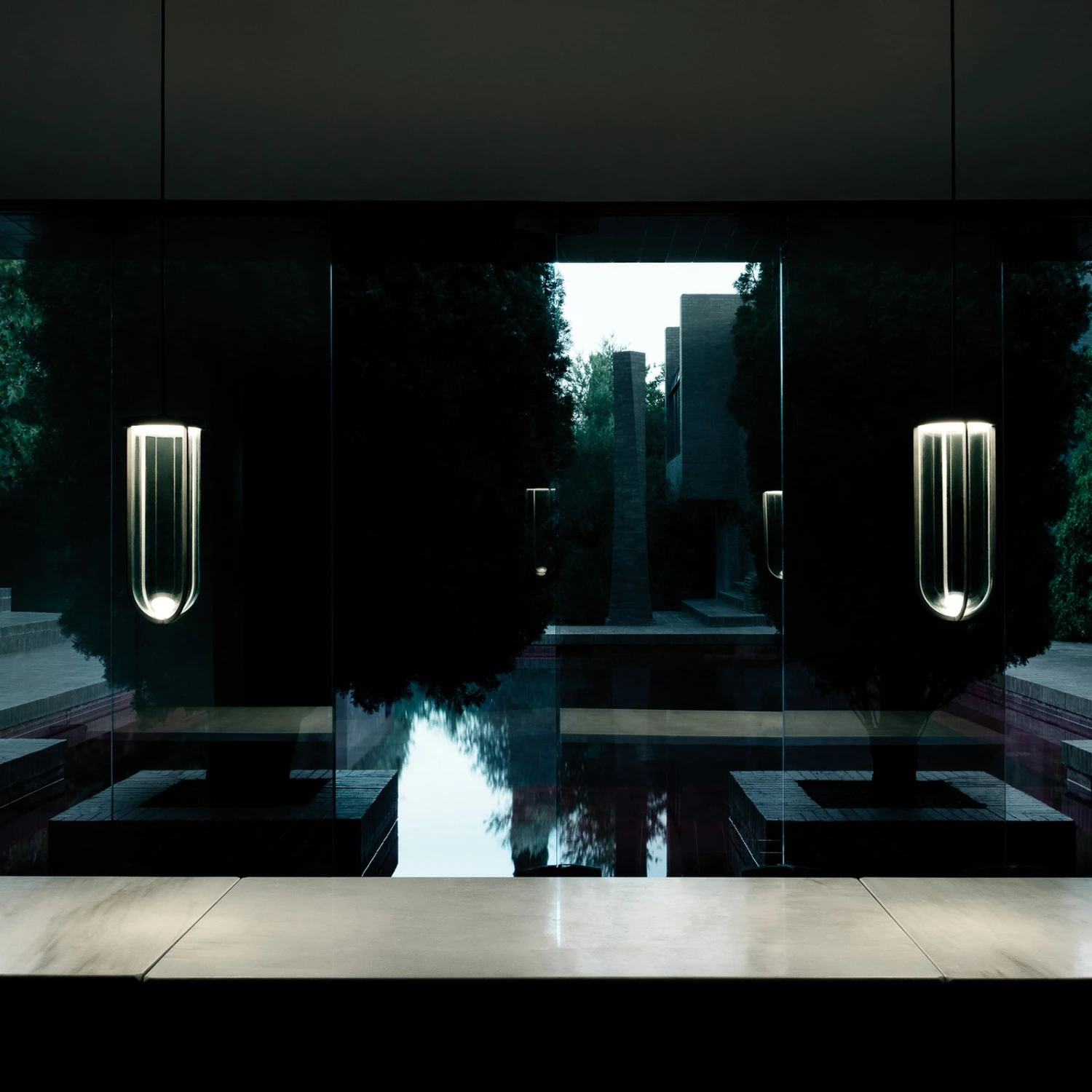 Der längliche Leuchtenkörper der Hängeleuchte In Vitro erinnert vage an eine althergebrachte Laterne, allerdings hat sie damit nur noch wenig gemeinsam. Die Leuchtmittel, also die LEDs, sind im oberen Teil hinter einem opalen Diffusor sichtgeschützt untergebracht. Hinter den Streben des Schirms befindet sich ein klares Schutzglas aus Borosilikatglas. Der metallene Korpus ist aus druckgegossenem und stranggepresstem, pulverlackiertem Aluminium.