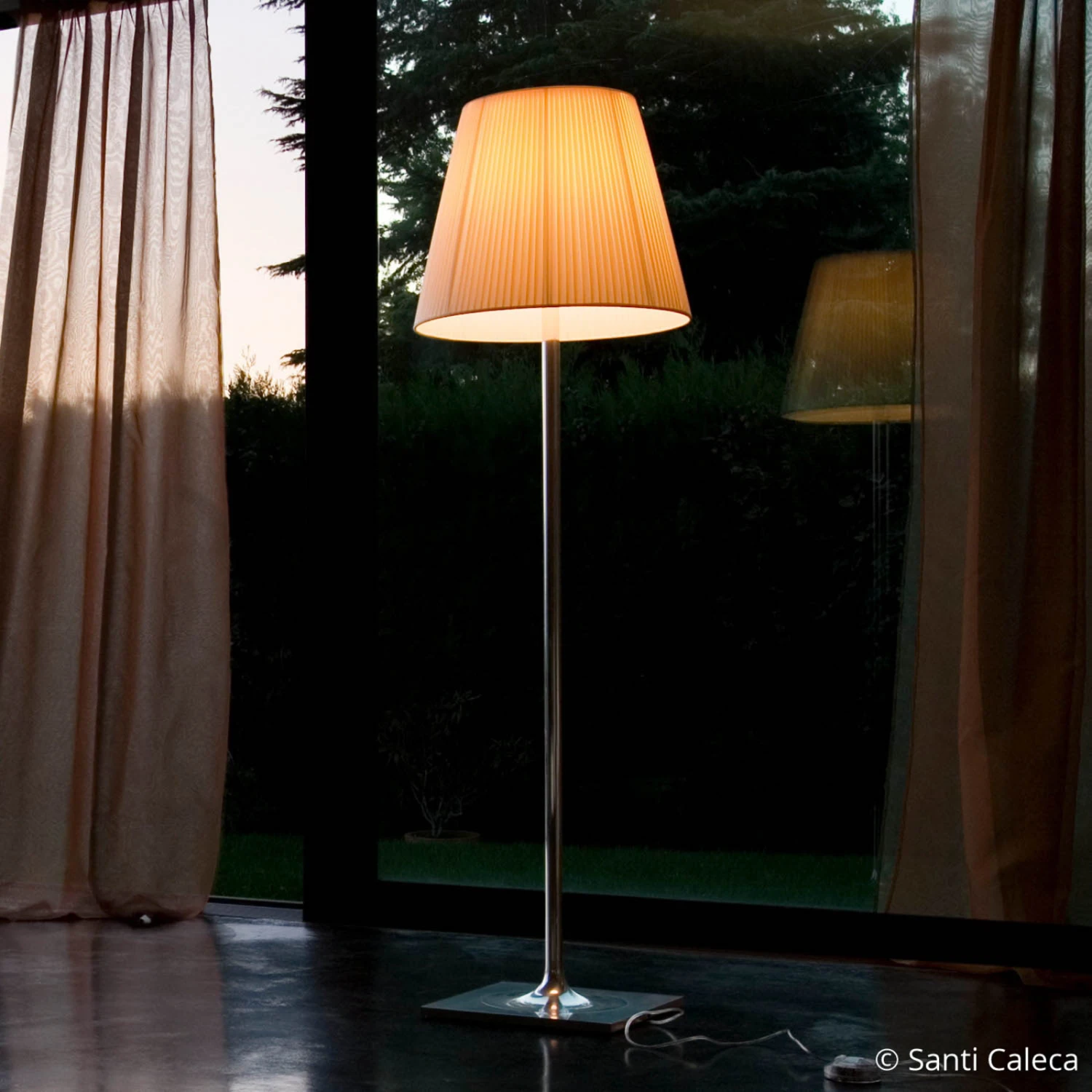 Ein Leuchtenmodell, das in puncto Optik und Funktion höchsten Ansprüchen gerecht wird, stellt die Stehleuchte KTribe von Philippe Starck, dem bekannten französischen Möbel- und Leuchtendesigner, dar. Diese Stehleuchte vereint die Klassik des Stoffschirms mit einem modernen Gestell aus verchromtem Metall. Fast unbemerkt sitzt unter dem Textilschirm noch ein zweiter Diffusor aus Kunststoff. Er hat die Form eines Kelches und garantiert eine homogene Lichtverteilung. Er ist auch bei eingeschalteter Beleuchtung unter dem beigen Stoff nur zu erahnen.