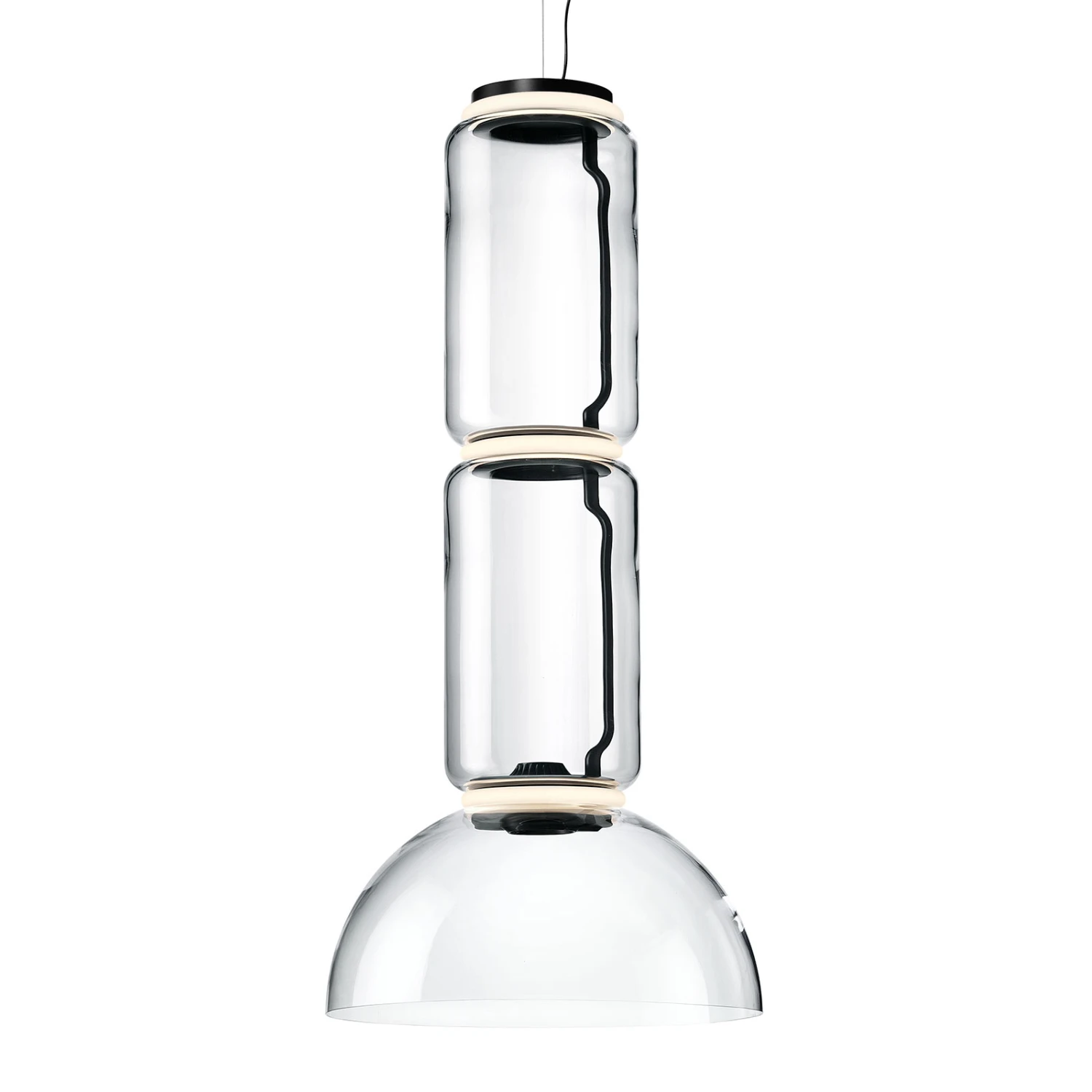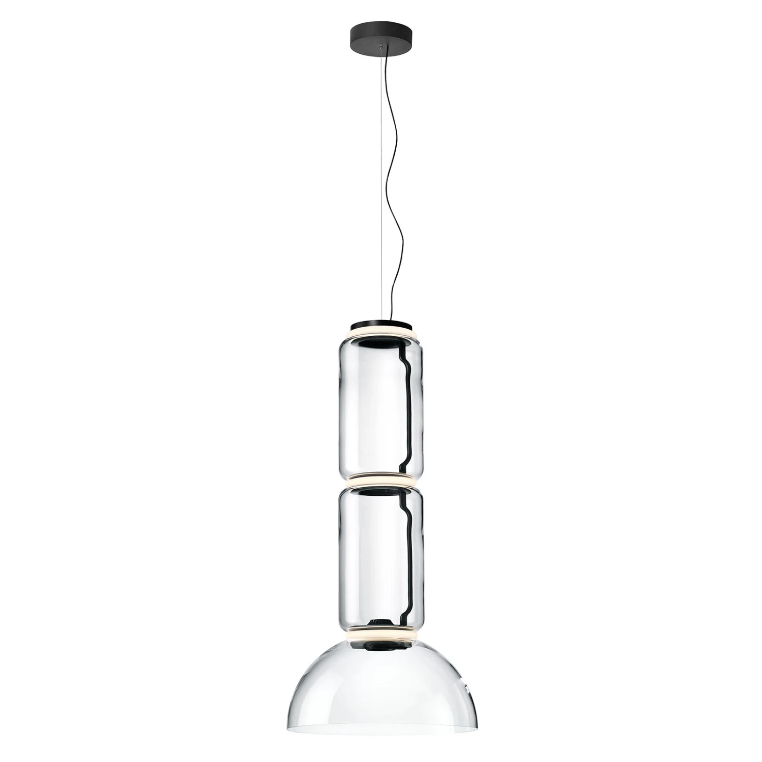 Die LED-Hängeleuchte Noctambule präsentiert sich ebenso unscheinbar am Tag, da sie aus einzelnen, mundgeblasenen Glaselementen zusammengesetzt ist, die sowohl zylindrisch wie auch halbkugelförmig sind. Zwischen den transparenten Gläsern ist fast unsichtbar je ein Lichtring unter einem opalen Silikondiffusor verbaut. Wird die Lichtquelle aktiviert, verzaubert Noctambule mit einem exzellent kalibrierten Licht und erzeugt mit der warmweißen Lichtfarbe eine wohlige und beeindruckende Atmosphäre, die tolle Akzente im Raum setzt.