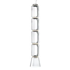 Die einzelnen Glasbausteine sind mundgeblasen und transparent gestaltet. Die Basis der Hängeleuchte bilden zylindrische Gläser, die am unteren Ende von einem kegelförmigen Glaselement ergänzt werden. Es entsteht ein modernes Lichtobjekt, das mit exzellent kalibrierter LED-Beleuchtung verschmilzt. Die Hängeleuchte strahlt im eingeschalteten Zustand warmweißes Licht in den Raum und setzt somit gekonnt Akzente. Sowohl im Wohnbereich wie auch in großzügigen Eingangsbereichen kommt Noctambule sehr gut zur Geltung. Die Verwendung in Hotel- und Gastronomiebereichen kann ebenso beeindruckende Beleuchtung erzielen.