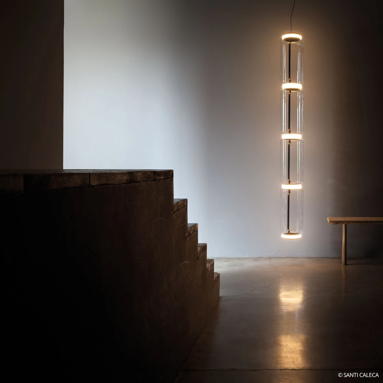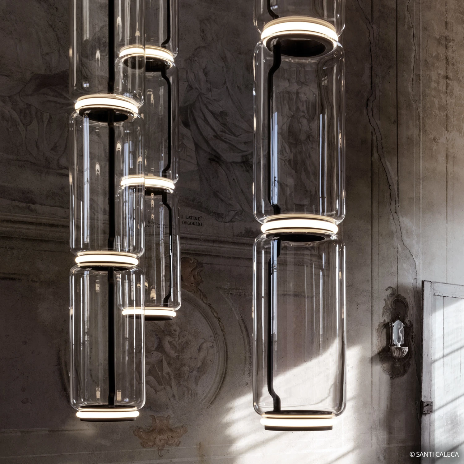 Der Designer Konstantin Grcic hat in Kooperation mit dem italienischen Leuchtenhersteller Flos die LED-Hängeleuchte Noctambule entworfen und setzt einzelne, zylindrische Glaselemente aus mundgeblasenem, transparentem Glas übereinander. Unterbrochen wird das Glaskonstrukt durch schmale, ringförmige Silikondiffusoren in opalweißer Farbe, unter denen sich die exzellent kalibrierte LED-Beleuchtung verbirgt. Die transparente Gestaltung lässt Noctambule eher unscheinbar wirken und integriert sich optimal in den Raum. Nicht nur in privaten Wohnräumen und hohen Eingangsbereichen, sondern auch im Hotelambiente kann die Hängeleuchte in ihrer Gesamtheit erstrahlen und jeden Betrachter verzaubern.