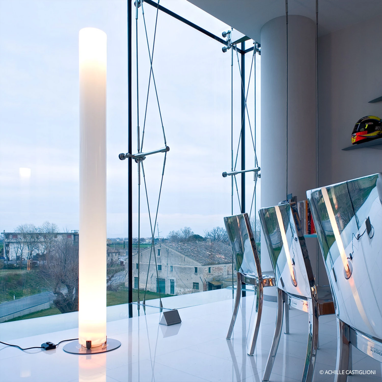 Die Stehleuchte STYLOS wurde entworfen von Achille Castiglioni, welcher seit Anbeginn der Firmengeschichte neue Beleuchtungsideen entwickelt.