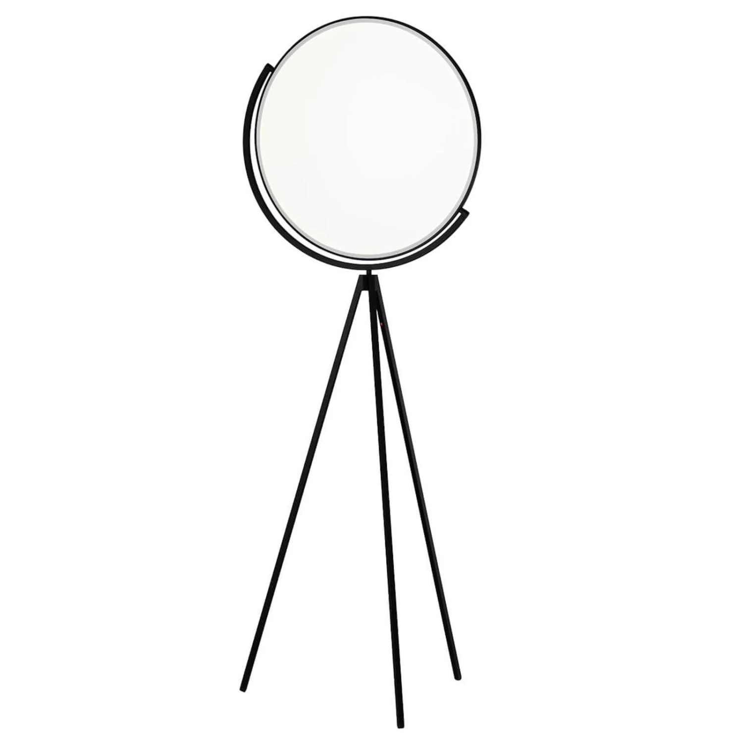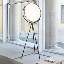 Superloon zählt zu den besonders extravaganten Lichtspendern unter den Stehleuchten, weil sie nicht besonders viel mit dem Stereotyp einer Stehleuchte gemeinsam hat. Das schwarze Gestell der Designer-Stehleuchte von FLOS hat eine puristische Dreibeinform und darauf ist in eine gabelförmige Halterung eine runde Leuchtscheibe eingelassen, die außerordentlich helles Licht erzeugen kann. Um die Ausrichtung des Lichts besser verändern zu können, ist die Leuchtscheibe beweglich gestaltet worden, d. h. sie lässt sich in der Gabel drehen. Damit ist auch möglich, ein eher indirektes Licht zu erzeugen, wenn man die Scheibe vom Betrachter wegdreht.