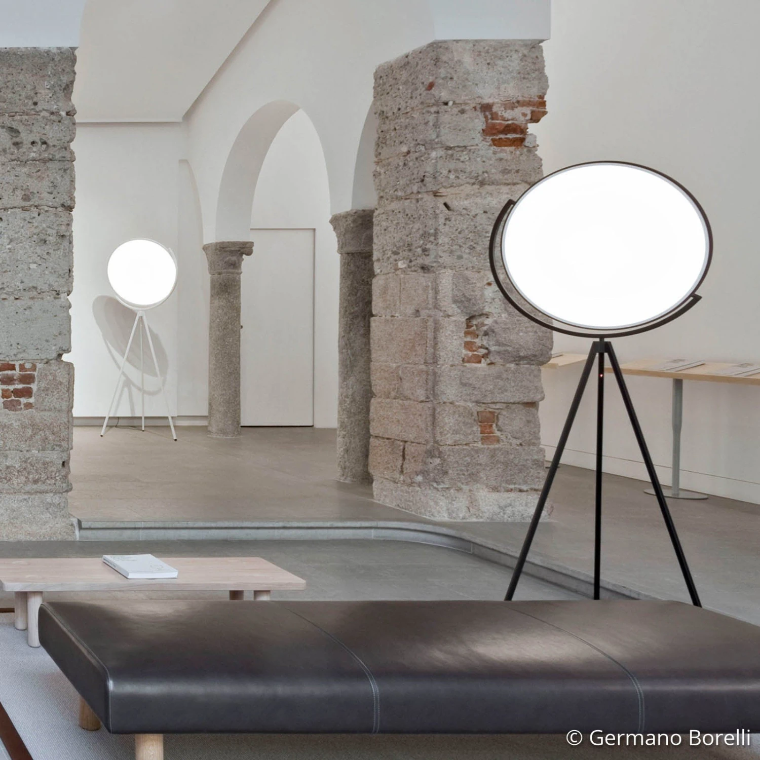 Außergewöhnliche Designer-Stehleuchte Superloon mit flachem, rundem Leuchtkopf, hoher Leuchtkraft und variabler Lichttemperatur