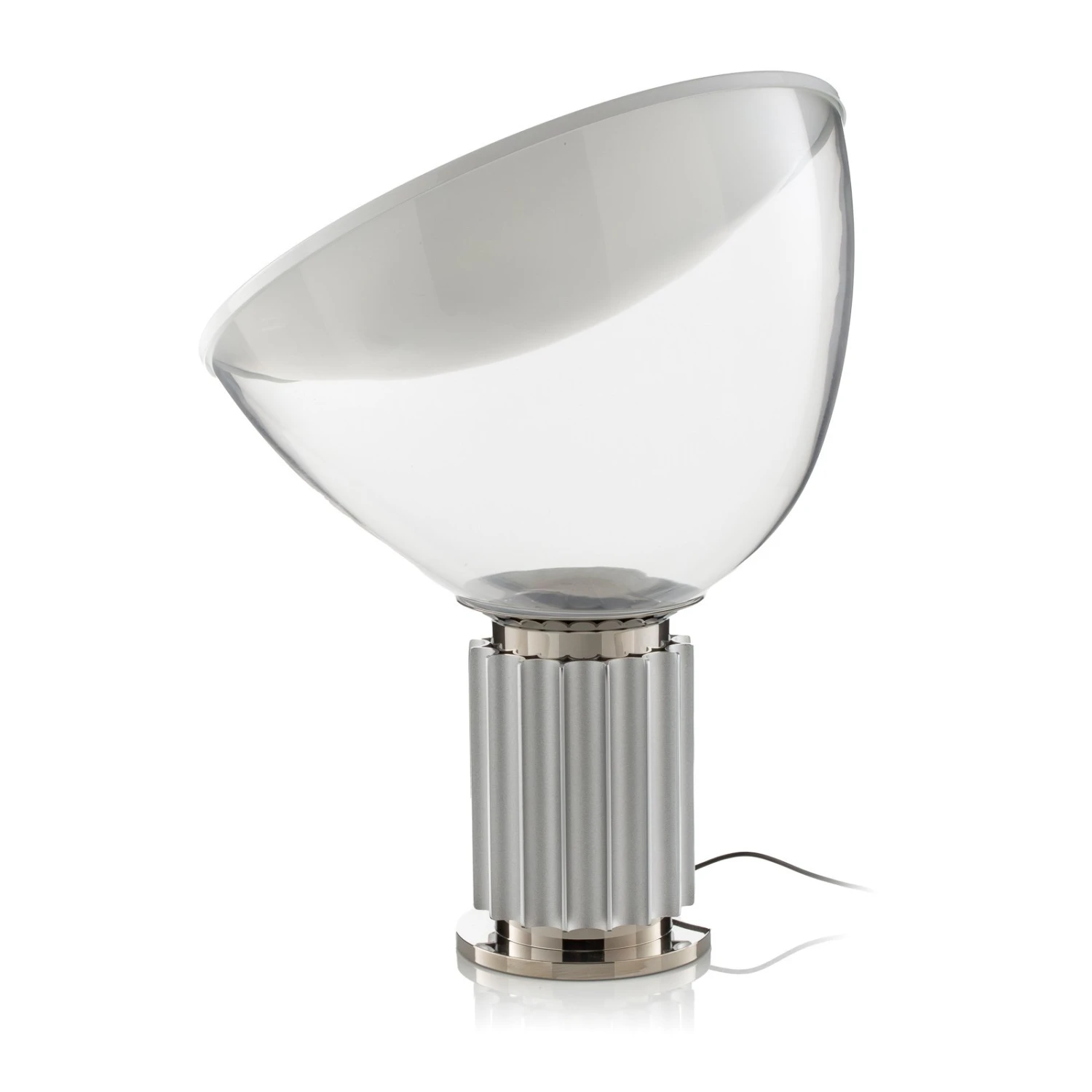 Die Leuchten des italienischen Unternehmen FLOS zeugen allesamt von höchster Qualität und genügen höchsten Designansprüchen. Der Reflektor der Tischleuchte Taccia small besteht aus Aluminium, der Diffusor wurde aus transparentem mundgeblasenem Glas hergestellt. Die Lichtintensität kann mittels des Switch-Dimmers von 10 bis 100 Prozent eingestellt werden.