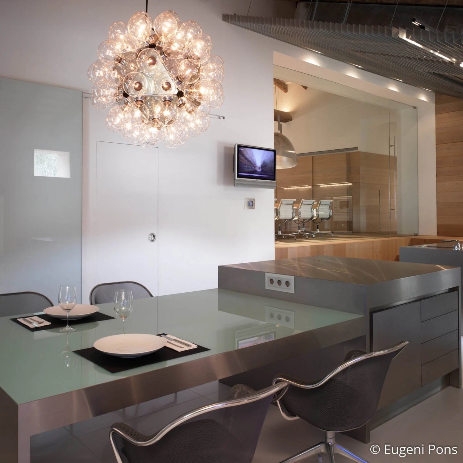 Die LED-Pendellampe Taraxacum 88 erstrahlt in einem hellen, funkelnden Licht, weil so viele warmweiße LED-Leuchtmittel in das Gestell dieser Leuchte eingedreht werden. Dadurch entsteht eine besondere Glasoptik, die auch schon in ausgeschaltetem Zustand einiges hermacht. Die Seilabhängung hat eine komfortable Länge von 5,5 Metern und die Design-Pendellampe kann daher auch gut in sehr hohen Räumen montiert werden, die ohnehin schon einen erhabenen Charakter besitzen.