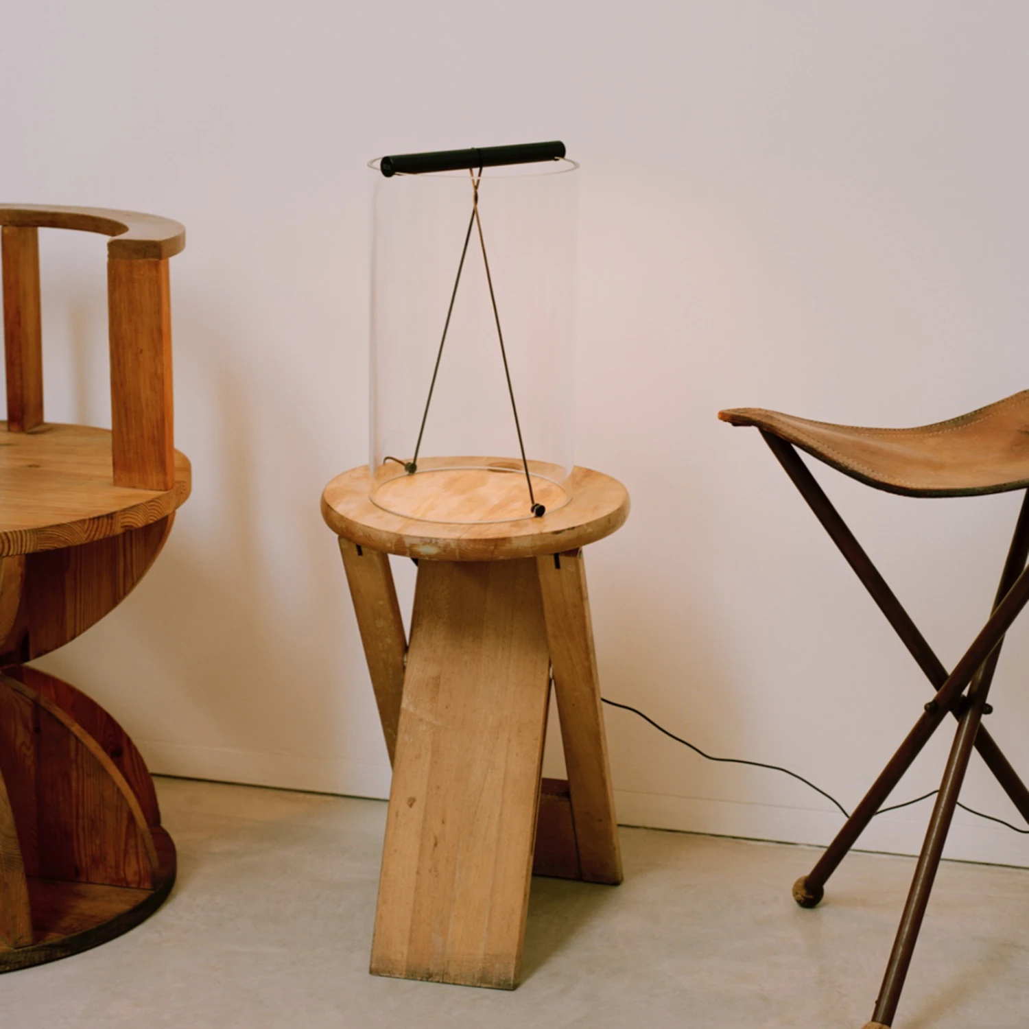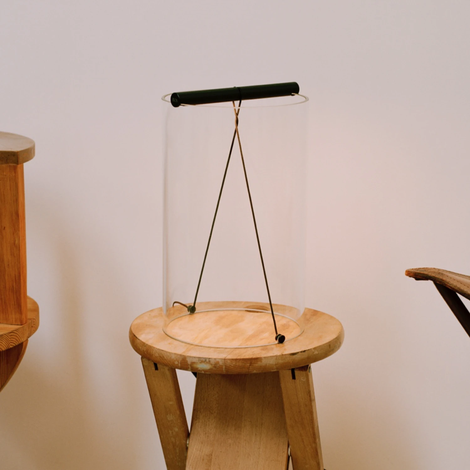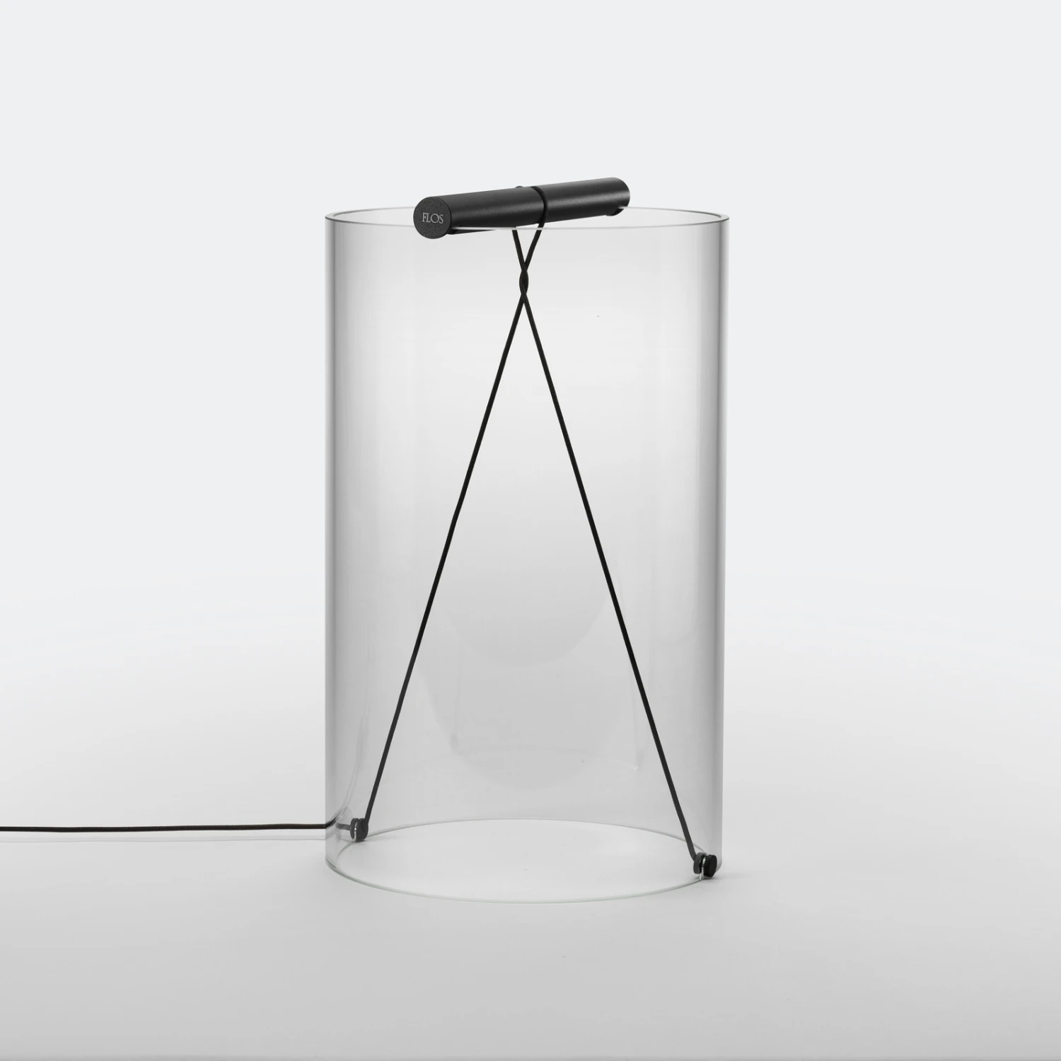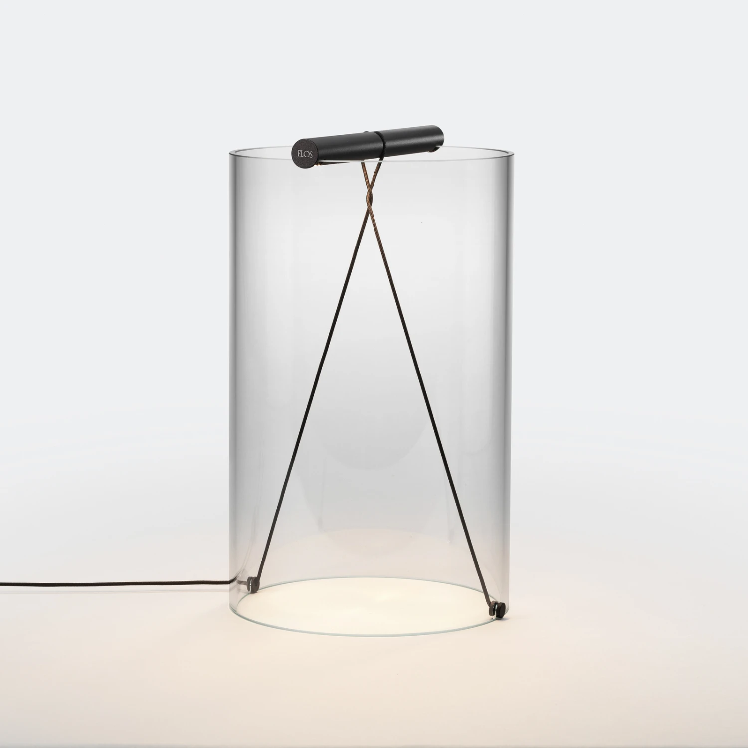 Als Basis dient ein offener Zylinder aus Glas, auf dem der Griff aus Aluminium sitzt. Dieser wird von einem textilummantelten Kabel gehalten, das auf gegenüberliegenden Seiten der Unterkante des Zylinders arretiert wird. Im Griff selbst finden sich die integrierten, nach unten gerichteten LEDs, die warmweißes Licht mit einer guten Farbwiedergabe erzeugen.